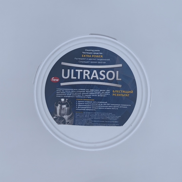 Фильерная паста "Ультразол" идентична пасте "Блиц". Но, компоненты, входящие в состав этой пасты, тверже. Химические компоненты "агрессивнее", но не наносят вреда деталям.Хорошо подходит для очистки грануляторов, экструдеров, работающие со вторичным сырьем.